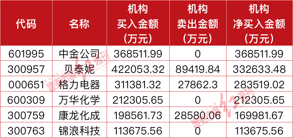 具体到个股中,有240家公司二季度期间被机构资金净买入(完整表格领取方式见文末),其中,中金公司、贝泰妮被暴买超过30亿元,而格力电器、万华化学也被净买入20亿元以上。