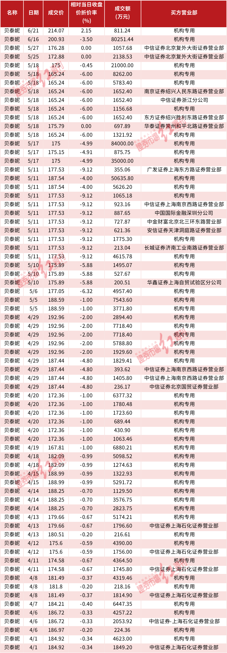 大宗交易数据显示,今年二季度,机构对贝泰妮吸筹明显,72笔大宗交易中有59笔涉及机构买卖,机构资金合计净买入33.26亿元。