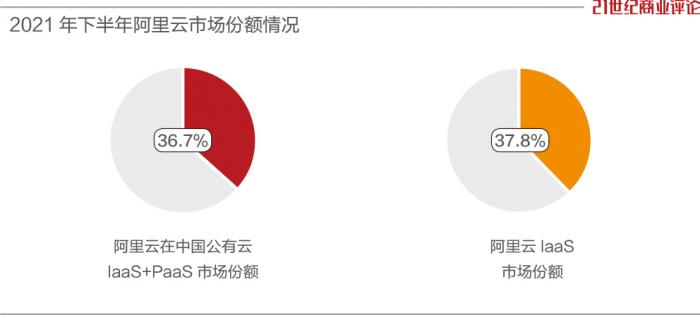 阿里云在中国公有云IaaS+PaaS市场,排名第一,但市场份额从2021年上半年的37.9%下降到下半年的36.7%,减少了1.2%。