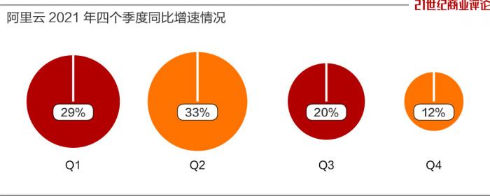 过去这个财年,阿里云四个季度收入的同比增速,分别为29%、33%、20%、12%。