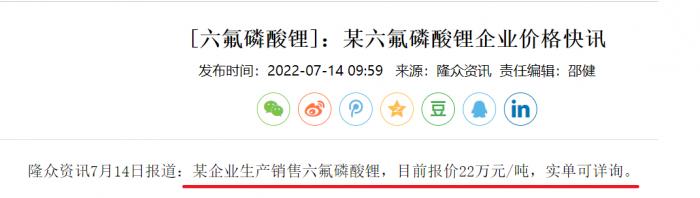 隆众资讯7月14日的最新数据显示,“某企业生产销售六氟磷酸锂,目前报价22万元/吨”,这一价格已较年初跌去了超5成。