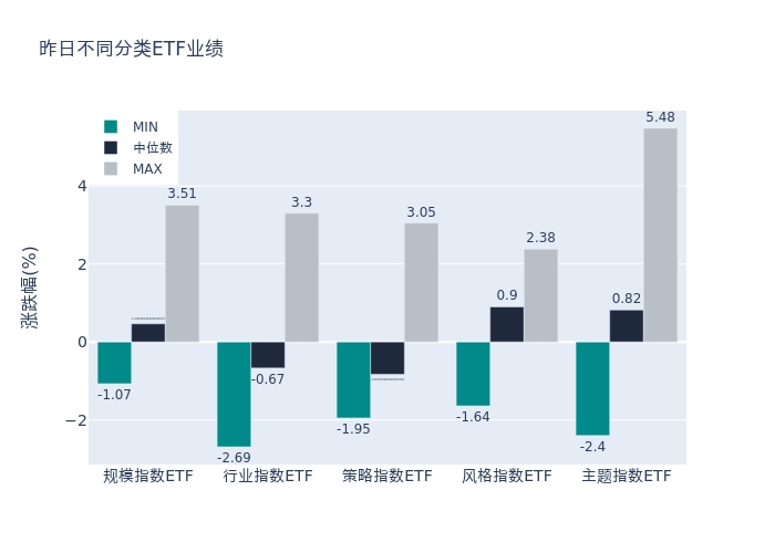 昨日股票型ETF收益率中位数为0.52%。其中按照不同分类,规模指数中博时中证科创创业50ETF收益率最高,为3.51%;行业指数中国联安创业板科技ETF收益率最高,为3.3%;策略指数中华安创业板50ETF收益率最高,为3.05%;风格指数中华夏创成长ETF收益率最高,为2.38%;主题指数中汇添富中证电池主题ETF收益率最高,为5.48%。