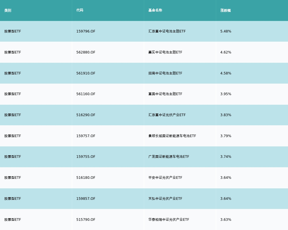 昨日股票型ETF涨幅最高的3支ETF及其收益率分别为:汇添富中证电池主题ETF(5.48%)、嘉实中证电池主题ETF(4.62%)、招商中证电池主题ETF(4.58%)。涨幅前10详情见下表: