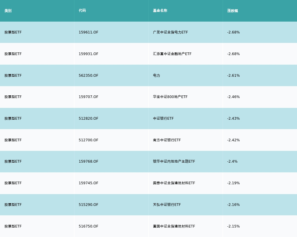昨日股票型ETF跌幅最大的3支ETF及其收益率分别为:广发中证全指电力ETF(-2.68%)、汇添富中证金融地产ETF(-2.68%)、电力(-2.61%)。跌幅前10详情见下表: