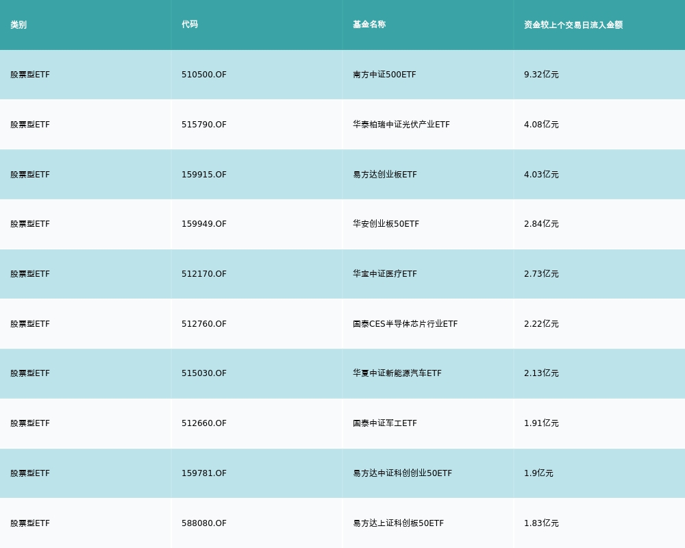 昨日股票型ETF资金流入最多的3支ETF及其流入金额分别为:南方中证500ETF(流入9.32亿元)、华泰柏瑞中证光伏产业ETF(流入4.08亿元)、易方达创业板ETF(流入4.03亿元)。资金流入前10详情见下表: