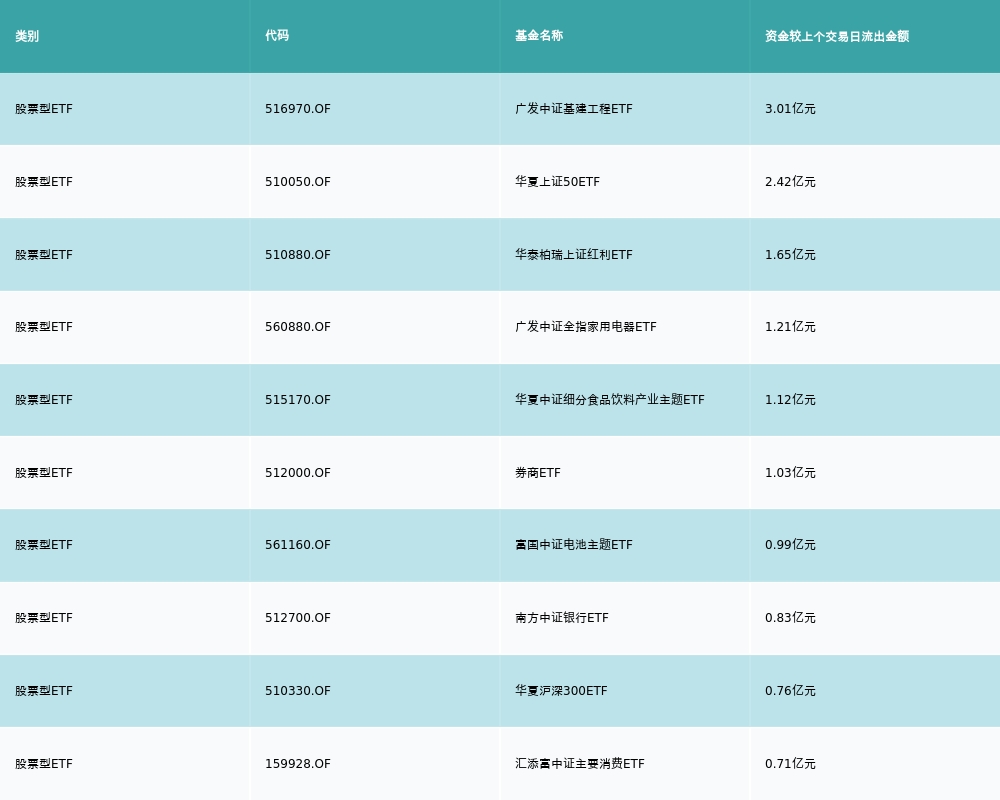昨日股票型ETF资金流出最多的3支ETF及其流入金额分别为:广发中证基建工程ETF(流出3.01亿元)、华夏上证50ETF(流出2.42亿元)、华泰柏瑞上证红利ETF(流出1.65亿元)。资金流出前10详情见下表: