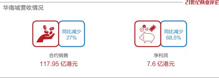 2022财年,华南城的合约销售约117.95亿港元,同比减少27%;净利润为7.6亿港元,同比减少68.5%。