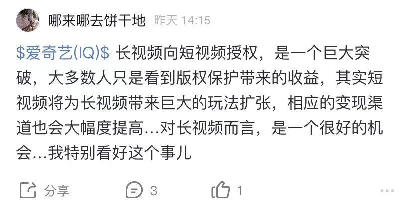 有爱奇艺投资人在雪球信心满满地表示:短视频将为长视频带来巨大的扩张玩法,相应的变现渠道也会大幅提高。受与抖音合作这一利好消息的刺激,爱奇艺美股股价当天上涨近10%。
