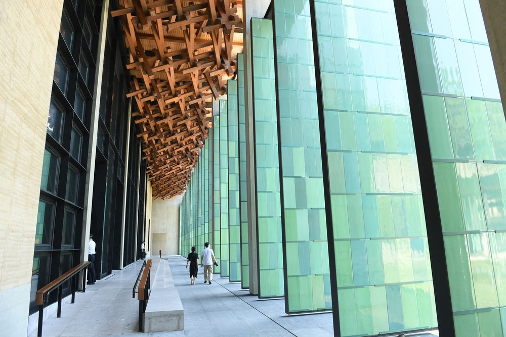 ↑杭州国家版本馆屋顶的木构和青瓷门扇相映成趣(7月23日摄)。