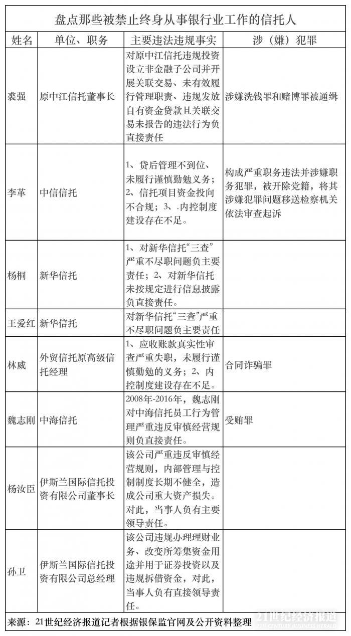 今年7月份,监管公告已有4名信托从业者被终身禁业,具体包括:中信信托原资本运营二部总经理李革、原中江信托董事长裘强、新华信托王爱红、新华信托杨桐。