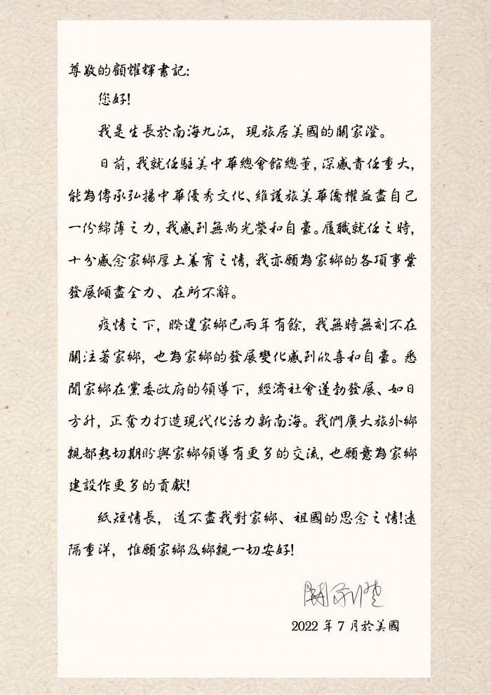 7月初,一封来自大洋彼岸的家书经由南海区委统战部抵达南海区委书记顾耀辉手中。纸短情长,道尽旅美南海乡贤、驻美中华总会馆总董关家澄对家乡的桑梓情谊和参与家乡建设的强烈愿望。