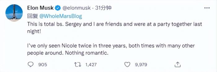 马斯克连夜否认称:“谢尔盖·布林和我是朋友,昨晚一起参加了一个聚会!三年内,我只见过妮可两次,都是和周围许多人在一起,没有恋情。”