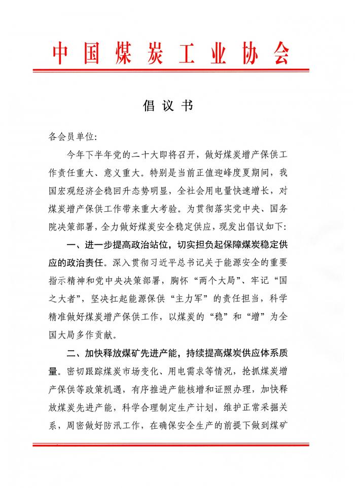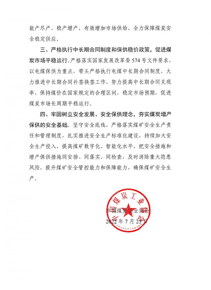 中国煤炭工业协会发布倡议书。其中提出,严格执行中长期合同制度和保供稳价政策,促进煤炭市场平稳运行。严格落实国家发展改革委574号文件要求,以电煤保供为重点,带头严格执行电煤中长期合同制度,大力推进中长期合同补签换签工作,努力提高中长期合同兑现率,保持煤价在国家规定的合理区间,稳定市场预期,促进煤炭市场长周期平稳运行。