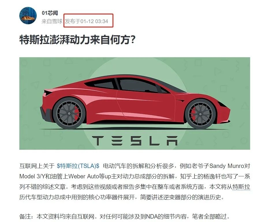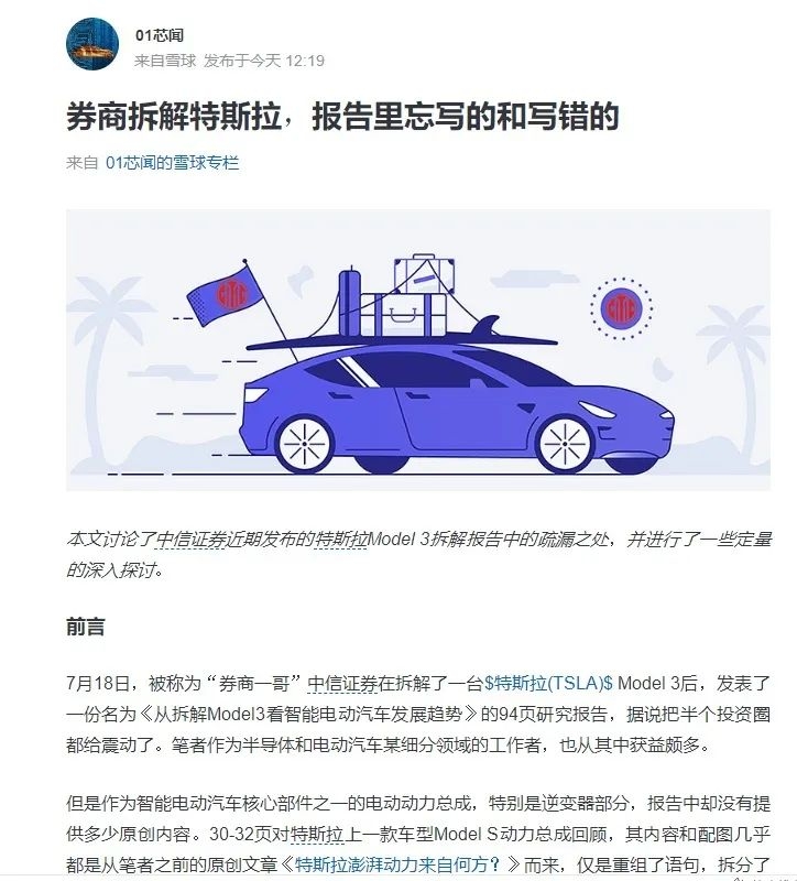 记者注意到,《特斯拉澎湃动力来自何方?》一文的发表时间为今年1月份,与中信证券《从拆解Model3看智能电动车发展趋势》研报在发表时间相隔了半年左右。而《特斯拉澎湃动力来自何方?》一文今年1月在雪球发布后,仅获得了1次转发和0次评论,显得关注度并不高。“01芯闻”目前在雪球上的粉丝数量也只有120位左右,与许多大V的粉丝数差距较大。此外,该文在名为“01芯闻”的个人公众号平台上也有发布。