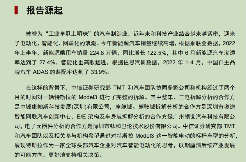 从这份研报披露的情况来看,这份研报的内容主要基于由中信证券研究部TMT和汽车团队协同多家公司和机构经过两个月的时间对一辆特斯拉Model3的完整拆解。