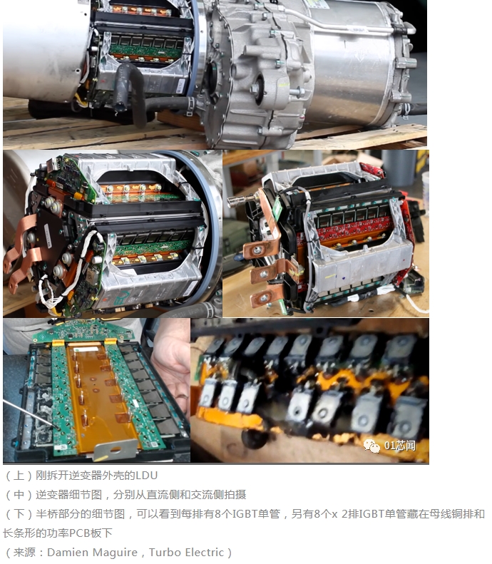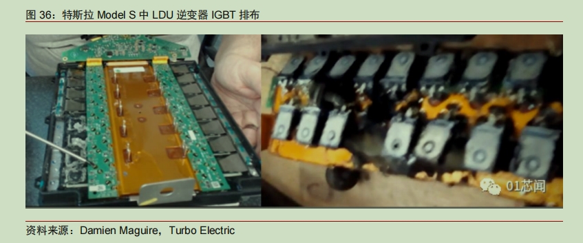 例如,中信证券研报30-32页中的插图35、插图36与《特斯拉澎湃动力来自何方?》一文的部分插图的重合度较高。值得一提的是,中信证券研报插图36的右下角恰好带有“01芯闻”的微信水印,而研报标注的资料来源却为“Damien Maguire,Turbo Electric”。