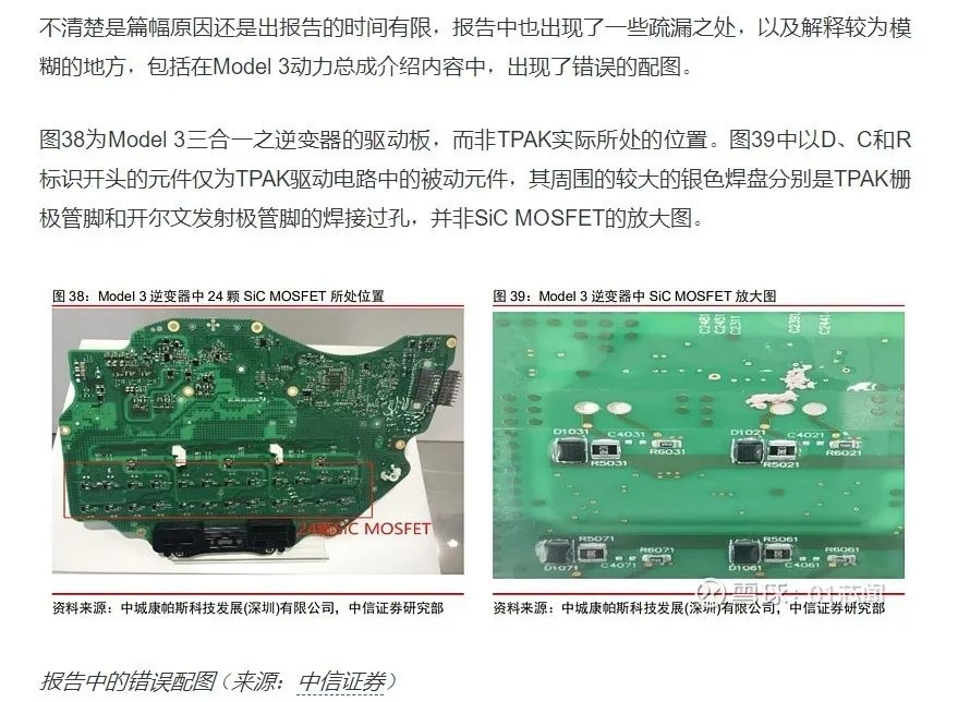 例如,“01芯闻”指出,中信证券研报中存在一些疏漏之处,以及解释较为模糊的地方,例如在研报对Model 3动力总成介绍内容中,出现了错误的配图,涉及插图38、39。