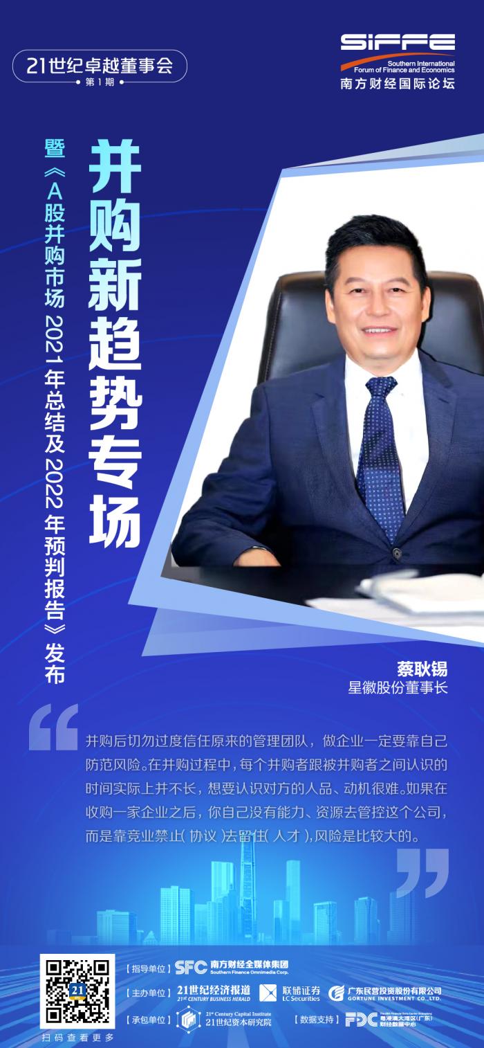 7月29日,由南方财经全媒体集团指导,21世纪经济报道、联储证券和粤民投联合发起的南方财经国际论坛21世纪卓越董事会第一期“并购新趋势专场暨《A股并购市场2021年总结及2022年预判报告》线上发布会”正式开幕。