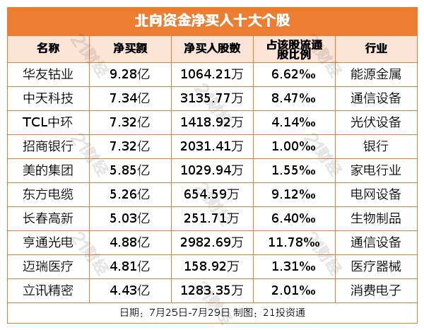 个股方面,北向资金净买入华友钴业(603799.SH)、中天科技(600522.SH)、TCL中环(002129.SZ)、招商银行(600036.SH)、美的集团(000333.SZ)居前,其中,华友钴业被净买入9.28亿元,中天科技被净买入7.34亿元,TCL中环被净买入7.32亿元,招商银行被净买入7.32亿元,美的集团被净买入5.85亿元。
