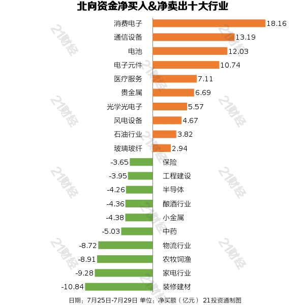 从净买入金额来看,北向资金增持了50个行业,其中消费电子居首,净买入金额达18.16亿元,其次是通信设备行业,净买入13.19亿元。