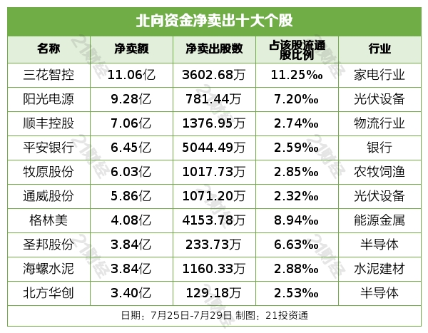北向资金净卖出三花智控(002050.SZ)、阳光电源(300274.SZ)、顺丰控股(002352.SZ)、平安银行(000001.SZ)、牧原股份(002714.SZ)居前,其中,三花智控被净卖出11.06亿元,阳光电源被净卖出9.28亿元,顺丰控股被净卖出7.06亿元,平安银行被净卖出6.45亿元,牧原股份被净卖出6.03亿元。