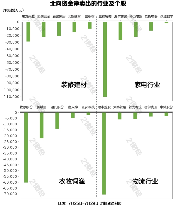 北向资金减持了50个行业,其中装修建材最多,净卖出金额达10.84亿元,其次是家电行业,净卖出9.28亿元。