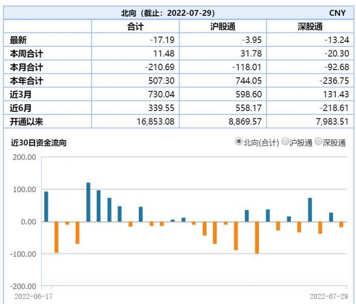 越声理财分析指出,本周五个交易日中,北向资金呈现一天流出次日流入的现象,周一、周三和周五三天录得净流出,而周二和周四录得净流入,全周合计净流入11.5亿元左右,结束了此前连续两周净流出的趋势。北向资金在7月份合计净流出210亿元,跟此前连续三个月净流入比较,对市场的态度明显有改变,由积极乐观转为相对谨慎。