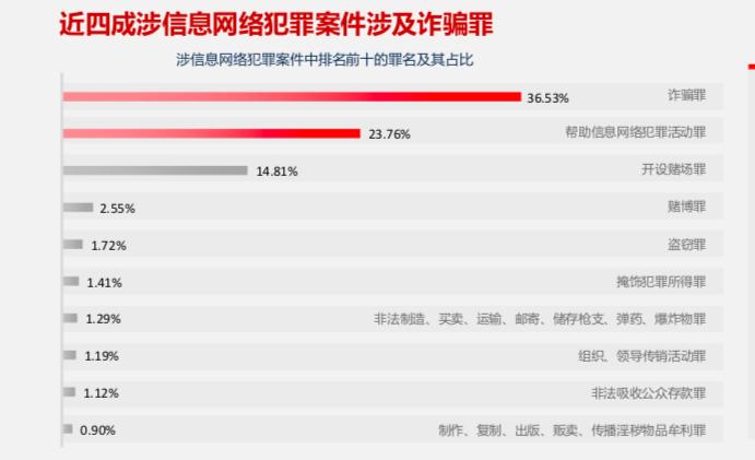 从涉信息网络犯罪案件罪名数量来看,2017年至2021年,全国涉信息网络犯罪案件共涉及282个罪名,其中诈骗罪案件量占比最高,为36.53%;其次为帮助信息网络犯罪活动罪,占比23.76%。