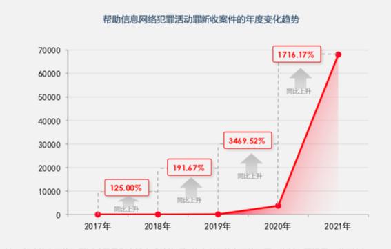 2017年至2021年,全国各级法院一审审结的帮助信息网络犯罪活动罪占涉信息网络犯罪案件的11.88%。其中各年度的占比分别为:0.06%、0.07%、0.22%、5.78%和54.27%。2021年帮助信息网络犯罪活动罪在涉信息网络犯罪案件中的占比开始激增。