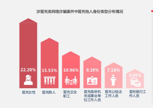 从被告人冒充他人身份类型来看,近五年冒充类网络诈骗案件中,被告人冒充女性、熟人居多。冒充女性占比最高为22.20%;其次为冒充熟人(15.53%);冒充企业职工(10.96%);冒充政府机关或事业单位工作人员(9.19%),冒充公检法工作人员(7.18%);冒充银行工作人员(5.05%)。其余冒充类型还有冒充通信运营人士、专业人士、学生、黑社会和航空公司等。