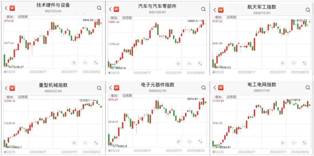 那么,除了科创50以外,还有哪些题材板块仍在延续反弹行情呢?司令从Wind中挖掘了6大强势指数,它们分别是:技术硬件与设备、汽车与汽车零部件、航天军工、重型机械、电子元器件、电工电网。