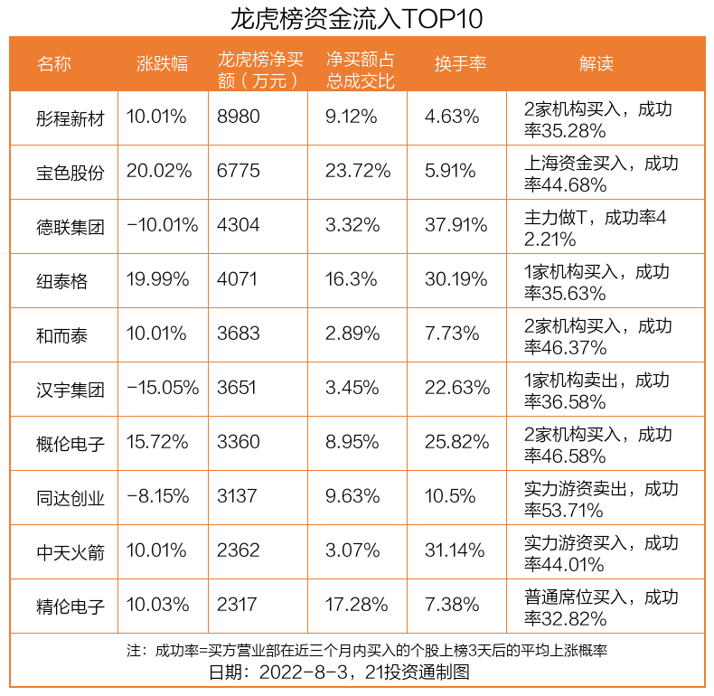 8月3日,上证指数下跌0.71%,深证成指下跌1.14%,创业板指下跌1.86%。盘后龙虎榜数据显示,共有50只个股因当日异动登上龙虎榜,资金净流入最多的是彤程新材(603650.SH),达0.9亿元。