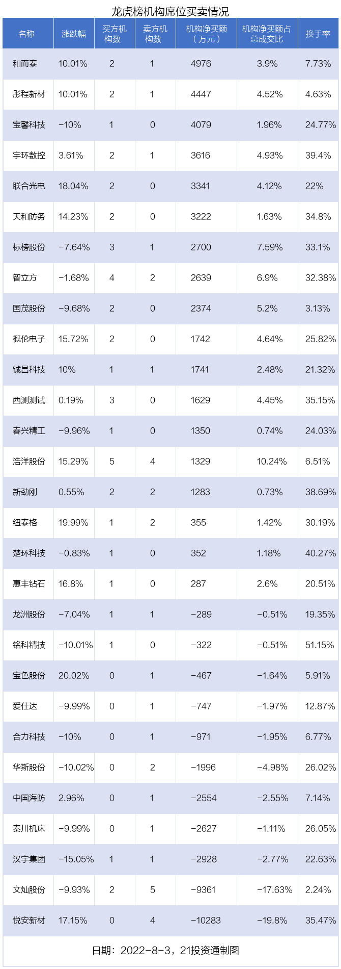8月3日,29只个股龙虎榜出现了机构的身影,机构合计净买入8919.02万元。具体来看,机构净买入18股,净卖出11股。