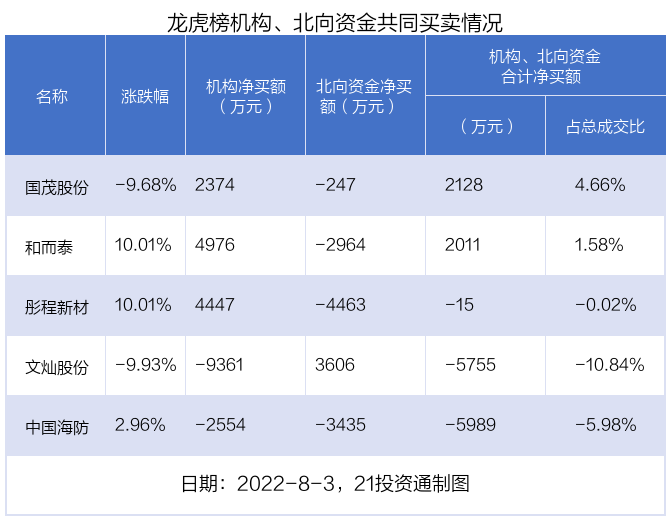 值得注意的是,机构和北向资金共同净卖出了中国海防;在文灿股份,国茂股份,和而泰,彤程新材上出现分歧,机构净卖出文灿股份9361万元,北向资金净买入3606.06万元;机构净买入国茂股份2374.45万元,北向资金净卖出246.77万元;机构净买入和而泰4975.64万元,北向资金净卖出2964.3万元;机构净买入彤程新材4447.41万元,北向资金净卖出4462.53万元。