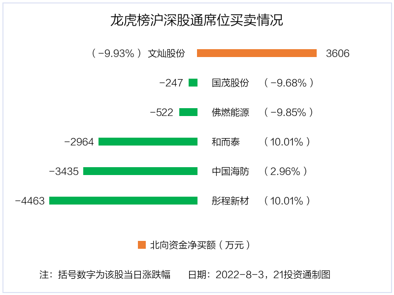 8月3日,北向资金参与龙虎榜中的个股共有6只,合计净卖出8024.3万元。其中沪股通净买入1 股,净卖出3 股,合计净卖出4537.99万元;深股通净卖出2 股,合计净卖出3486.3万元。