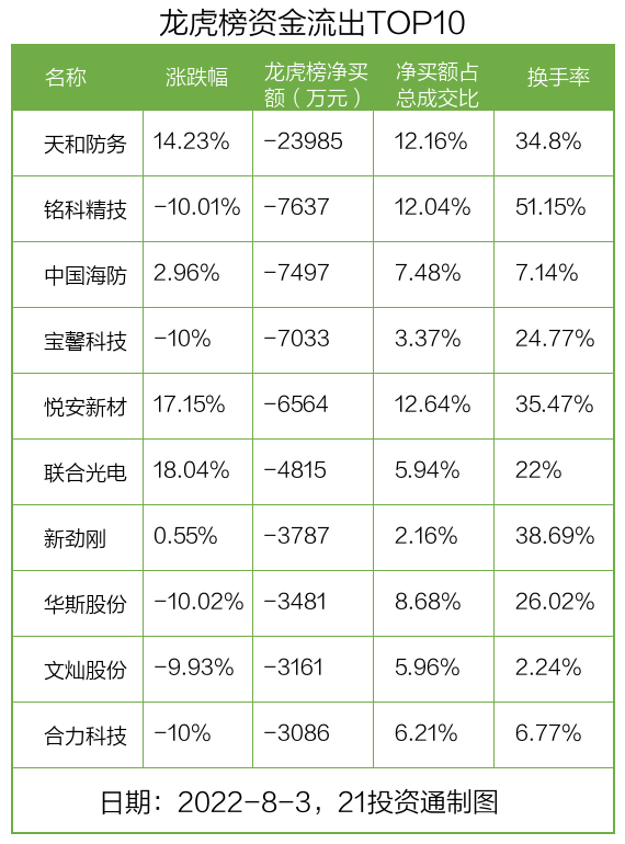 而龙虎榜中资金净流出最多的是天和防务(300397.SZ),被净卖出为2.4亿元,占总成交金额的12.16%。天和防务收盘上涨14.23%,换手率为34.8%。