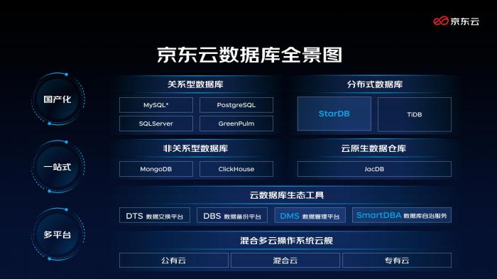 在此次大会上,京东云围绕着云上生态建设、基于业务场景的深度内核优化、自治服务能力打造和产业落地实践四个方面展开,并在会上发布了全新一代分布式数据库StarDB 5.0、数据库管理服务DMS和数据库自治服务SmartDBA,数据库产品矩阵再添新成员,阵容更加强大。