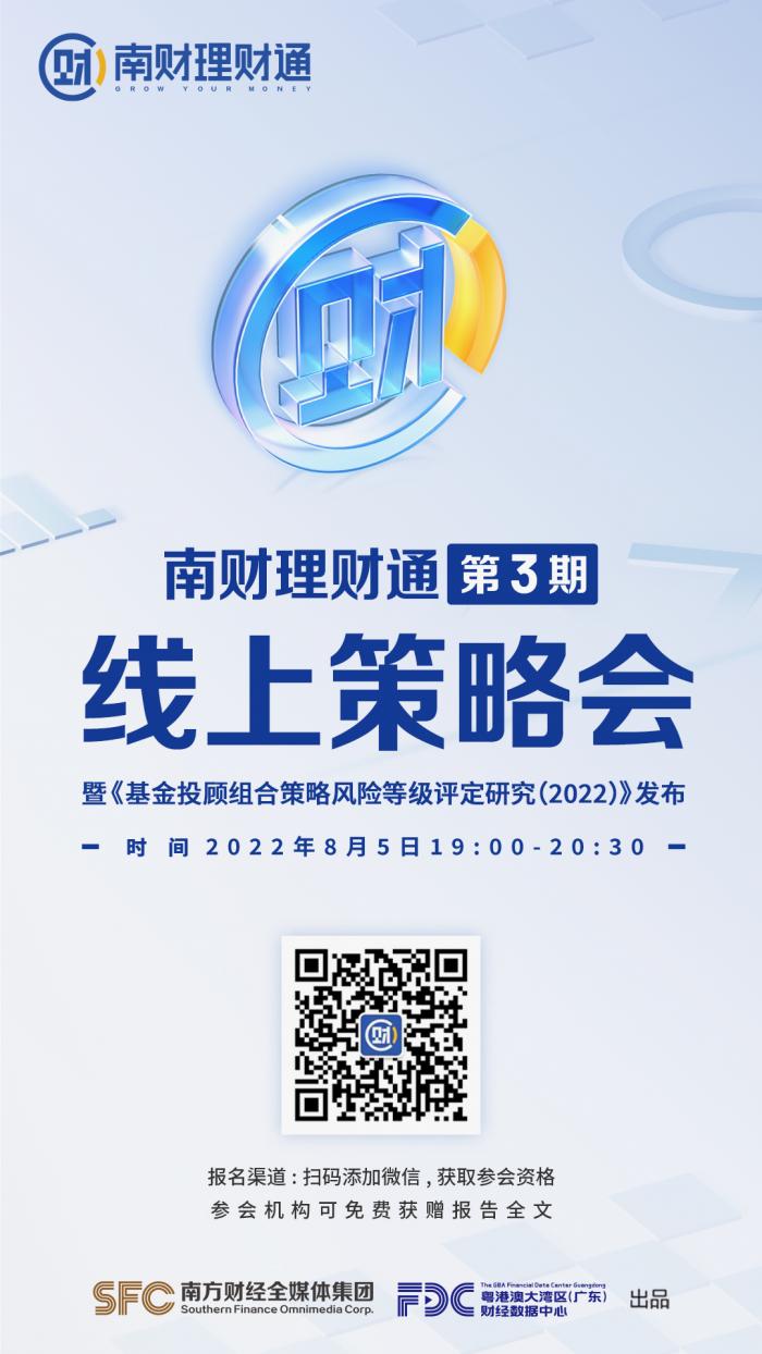 8月5日,南财理财通第三期线上策略会暨《基金投顾组合策略风险等级评定研究(2022)》发布,敬请期待!