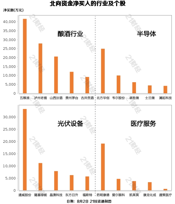 个股方面,北向资金净买入五粮液(000858.SZ)、通威股份(600438.SH)、泸州老窖(000568.SZ)、北方华创(002371.SZ)、山西汾酒(600809.SH)居前,其中,五粮液被净买入4.16亿元,通威股份被净买入3.33亿元,泸州老窖被净买入2.79亿元,北方华创被净买入2.49亿元,山西汾酒被净买入2.05亿元。