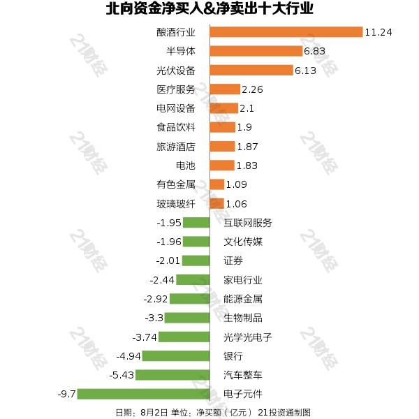 从净买入金额来看,北向资金增持了30个行业,其中酿酒行业居首,净买入金额达11.24亿元,其次是半导体行业,净买入6.83亿元。