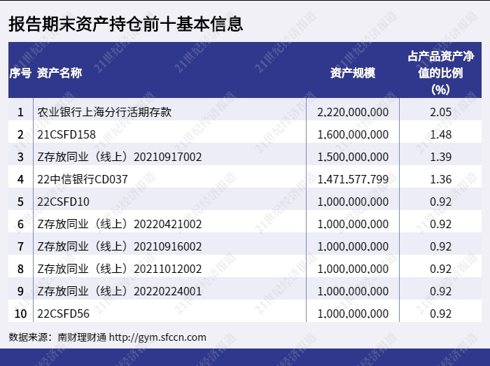 其中,第一大持仓“农业银行上海分行活期存款”的资产规模为22.20亿元,占产品资产净值的2.05%。第二大持仓“21CSFD158”的资产规模为16亿元,占产品资产净值的1.48%。第三大资产存放同业的资产规模为15亿元,占产品资产净值的1.39%。