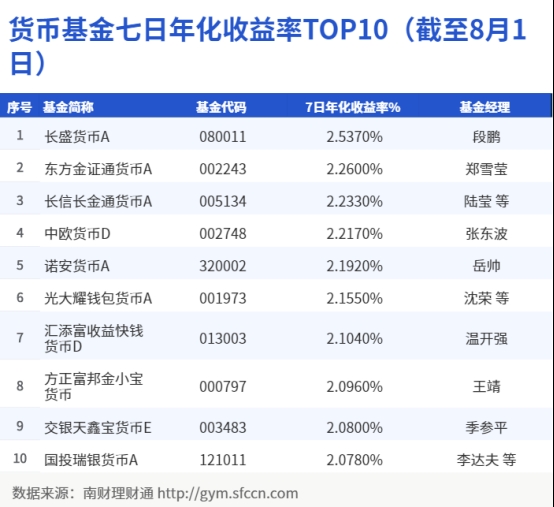 据南财理财通数据,截至8月1日,七日年化收益率排名前三的货币基金分别是“长盛货币A"、“东方金证通货币A"和“长信长金通货币A”。