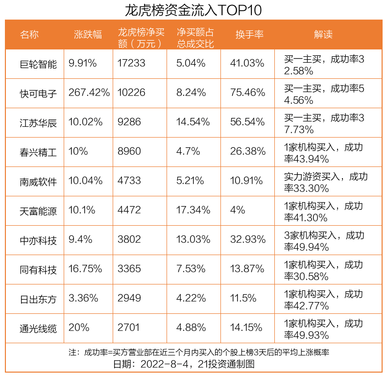 8月4日,上证指数上涨0.8%,深证成指上涨0.69%,创业板指上涨0.45%。盘后龙虎榜数据显示,共有48只个股因当日异动登上龙虎榜,资金净流入最多的是巨轮智能(002031.SZ),达1.72亿元。