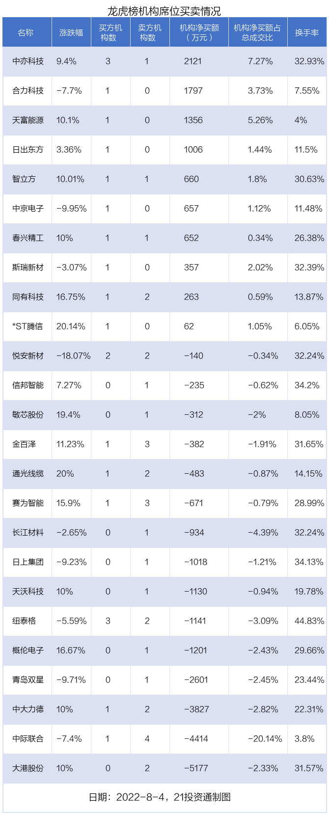 其中,机构净买入金额最多的是中亦科技(301208.SZ),当日收盘上涨9.4%,换手率为32.93%。前五大买卖营业部中有4家机构,为合计净买入2121万元,占总成交金额的7.27%。