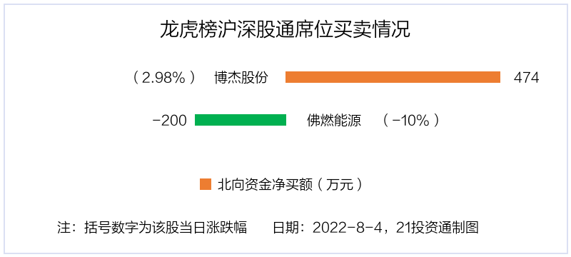8月4日,北向资金参与龙虎榜中的个股共有2只,合计净买入273.91万元。深股通净买入1股,为博杰股份(002975.SZ),净买入473.66万元,占总成交金额的1.86%;净卖出1股,为佛燃能源(002911.SZ),为199.76万元,占总成交金额的0.78%,当日收盘下跌10%,换手率为1.84%。