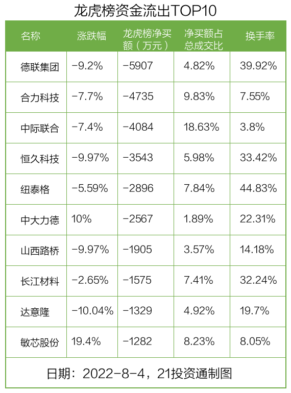 而龙虎榜中资金净流出最多的是德联集团(002666.SZ),被净卖出为0.59亿元,占总成交金额的4.82%。德联集团收盘下跌9.2%,换手率为39.92%。