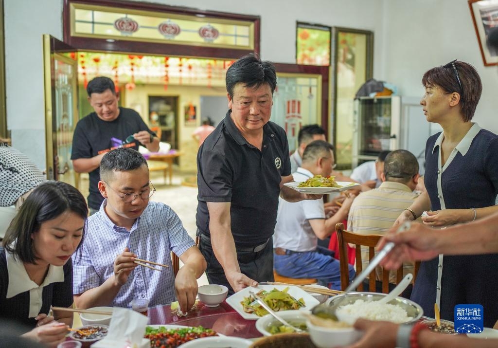 贵州省遵义市播州区枫香镇花茂村村民王治强为到农家乐就餐的游客上菜(2022年6月28日摄)。新华社记者 陶亮 摄