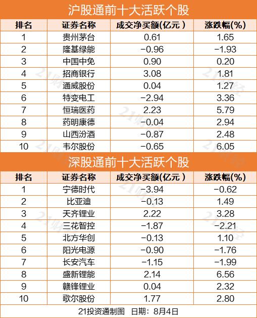十大活跃个股方面,招商银行(600036.SH)、恒瑞医药(600276.SH)、天齐锂业(002466.SZ)获净买入居前,金额分别为3.08亿元、2.23亿元、2.22亿元。