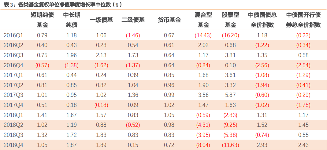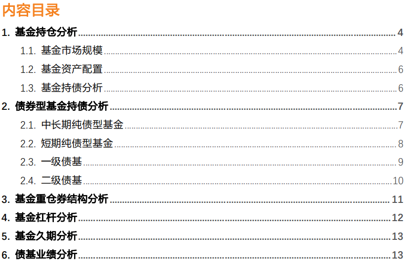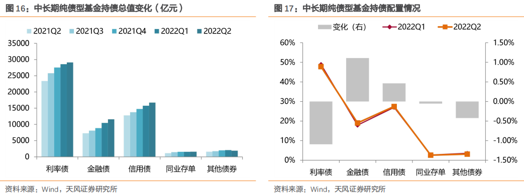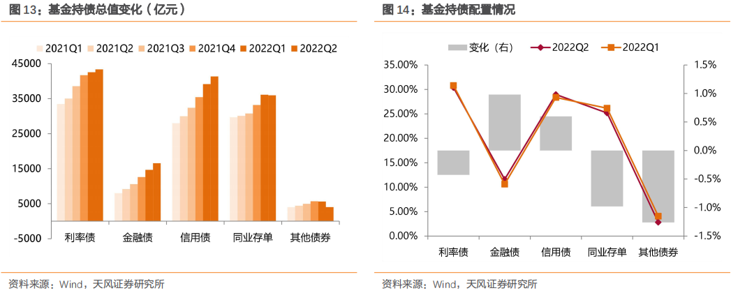中长期纯债型基金增加了对金融债、信用债的配置比例,减少了对利率债、同业存单、其他债券的配置比例;短期纯债型基金增加了对金融债、利率债、其他债券的配置比例,减少了对信用债、同业存单的配置;一级债基增加了对利率债、信用债、金融债、同业存单的配置比例,减少了对其他债券的配置比例;二级债基增加了对金融债的配置,减少了对利率债、信用债、同业存单、其他债券的配置。