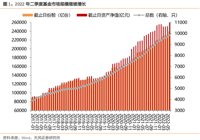 二季度基金净值有所回升。2022年二季度末,各类基金共计9842只,资产净值约26.67万亿元。相较于2022年一季度末,各类基金数量增加3.12%,资产净值增加6.34%。